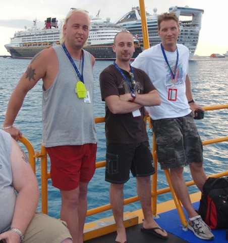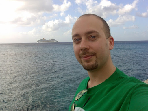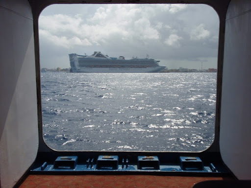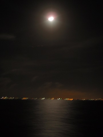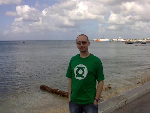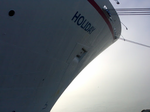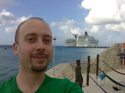 Uma das noites antes de chegarmos a Cozumel fomos os dois conversar para o Deck da tripulação. Fomos lá fora e o calor do México já se notava. Víamos a costa mexicana, lua cheia e outros navios de cruzeiro iluminados como cidades ambulantes a flutuar no horizonte. Foi um momento que não esquecerei e as fotos nocturnas que vêm neste post são daí. Tivemos um momento hilariante. Vimos uma bóia pendurada no varandim e perguntei-lhe "o que fazes se vires alguém caír ao mar?". Deu a resposta do livro e ambos aplaudimos porque somos agora tripulantes certificados em tudo o que são procedimentos de segurança a bordo! Reparei que preso à bóia havia um cilíndro vermelho, pendurado de pernas para o ar. Peguei no cilíndro para ver o que era e quando o virei para cima disparou um MEGA FLASH nos olhos! Instantaneamente ambos dissemos a mesma coisa... mas cada um na sua língua! Foi tão giro! Só eu percebi, e ri-me que nem um estúpido até que consegui respirar e explicar-lhe. É que no escuro da noite, levar com um flash que tem como objectivo tornar visível uma pessoa que caia na água, cegou-nos aos dois. O Dale mandou um "oh fuck!" e eu disse o mesmo em português! Ao mesmo tempo! Parece que não interessa de que país somos: quando nos assustamos com algo, a reacção não difere! ;)